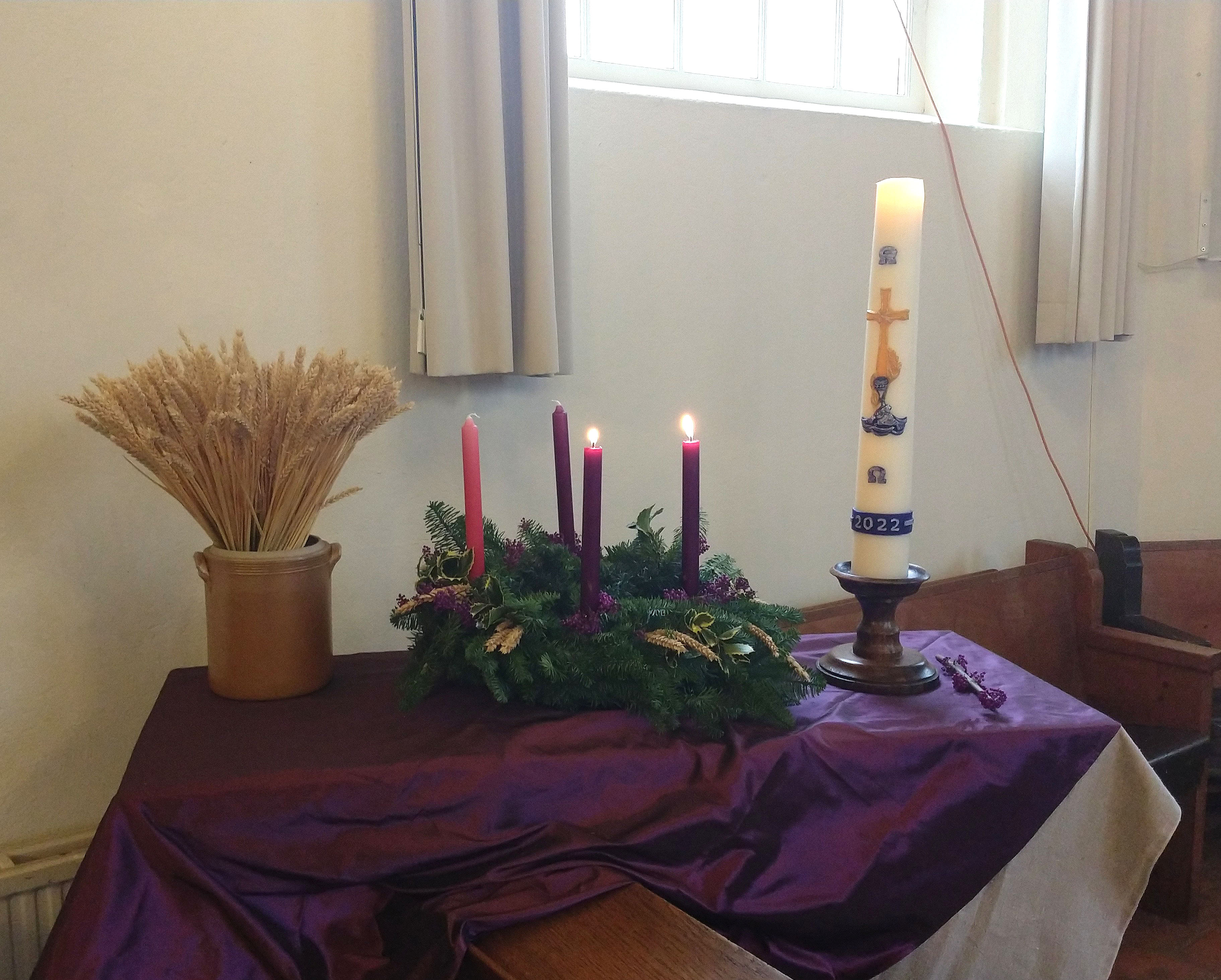 De adventskrans symboliseert de aarde, heel de wereld. Het groene sparrengroen en mos staat voor hoop en verwachting. De vier kaarsen geven de vier weken van voorbereiding aan als we uitzien naar de komst van Jezus Christus. Paars is de kleur van inkeer en bezinning voorafgaand aan het feest.