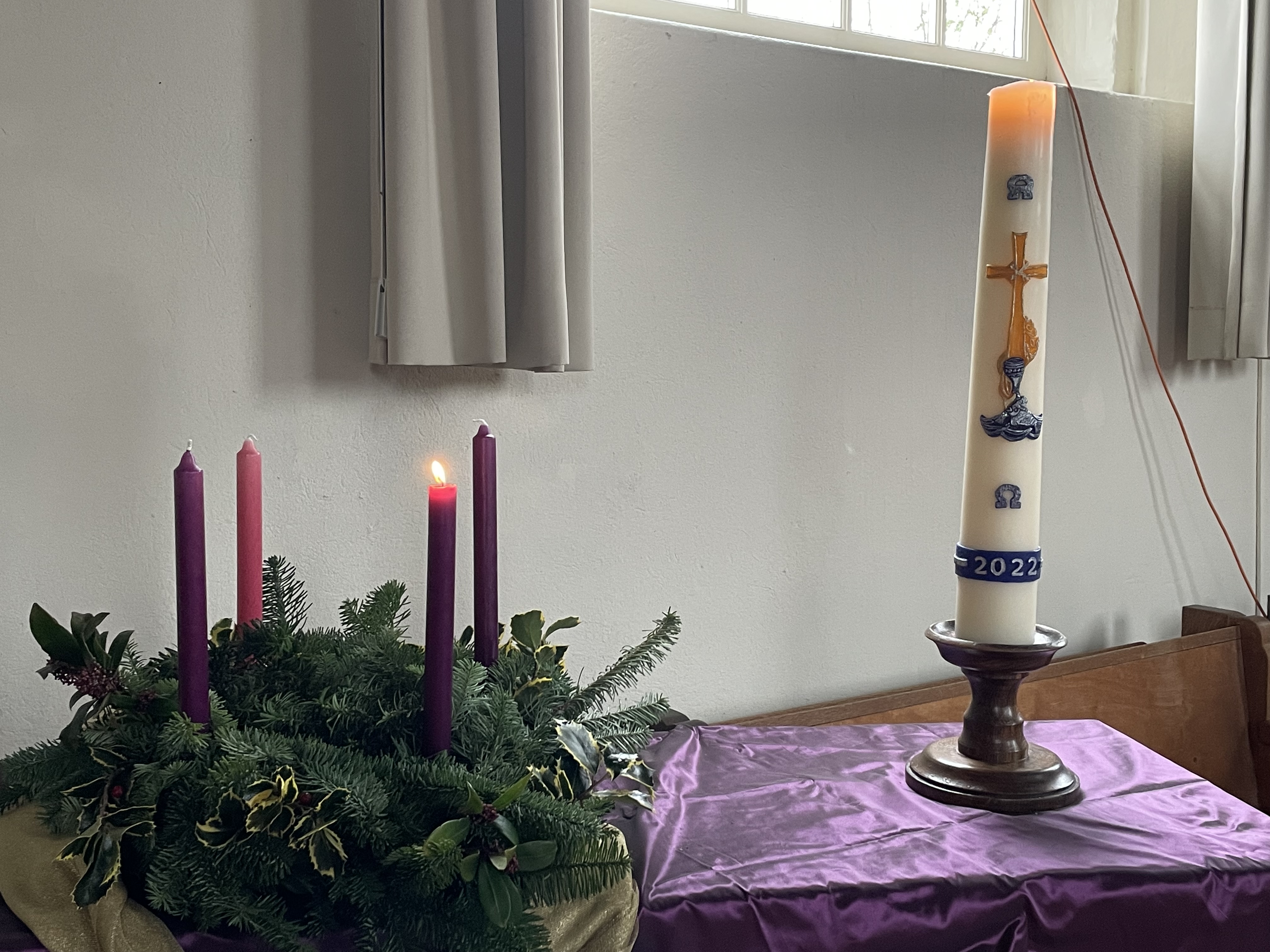 De adventskrans symboliseert de aarde, heel de wereld. Het groene sparrengroen en mos staat voor hoop en verwachting. De vier kaarsen geven de vier weken van voorbereiding aan als we uitzien naar de komst van Jezus Christus. Paars is de kleur van inkeer en bezinning voorafgaand aan het feest.